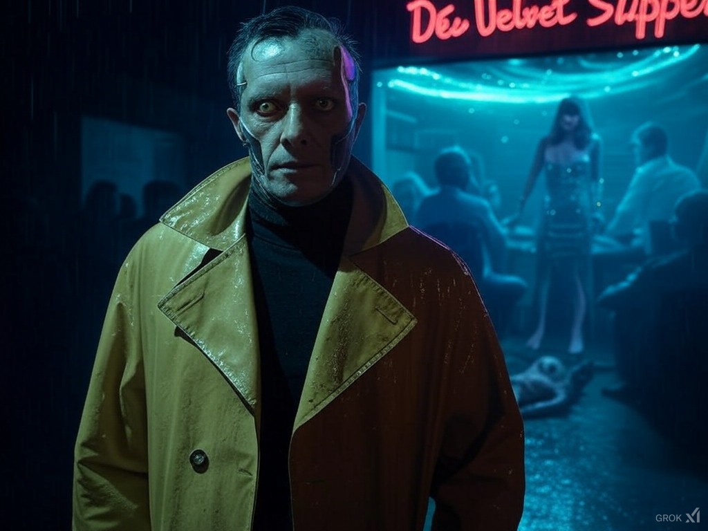 The neon sign of the “Velvet Slipper” buzzed and sputtered like a dying insect, its green light bleeding into the rain-slicked alley, pooling in oily puddles that reflected the fractured world above. Inside, the air was a soup of gin-soaked despair, cigarette smoke curling like spectral fingers around the throats of the damned. Dex, his trench coat clinging to him like a second skin, shivered not from the cold but from the electric unease that crawled up his spine. He was a shadow among shadows, watching the grotesque ballet unfold on the stage.