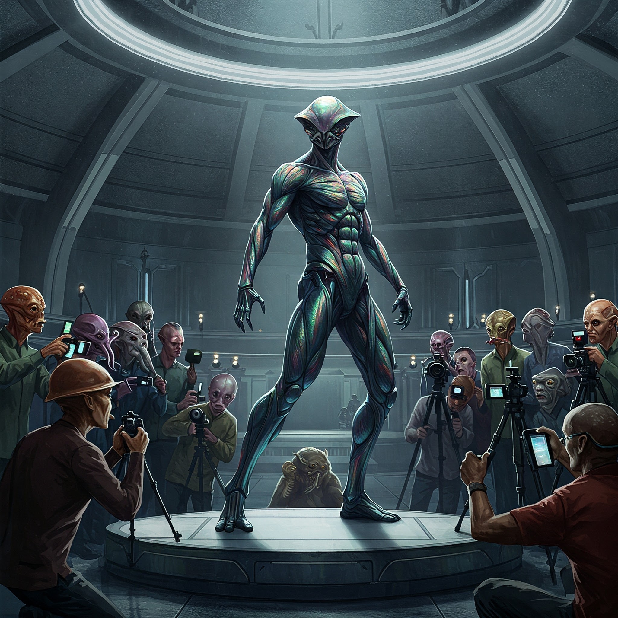 I adjusted my cranial membranes, the seventeen sensory filaments quivering as they picked up the acrid emanations of sweat and nutrient supplements that hung heavy in the recycled air. The gymnasium on Level 7 of the Interspecies Cultural Exchange Complex was packed with representatives from across the Galactic Council—tentacles, pseudopods, and vestigial appendages all clutching recording devices, desperate to capture the phenomenon before us.