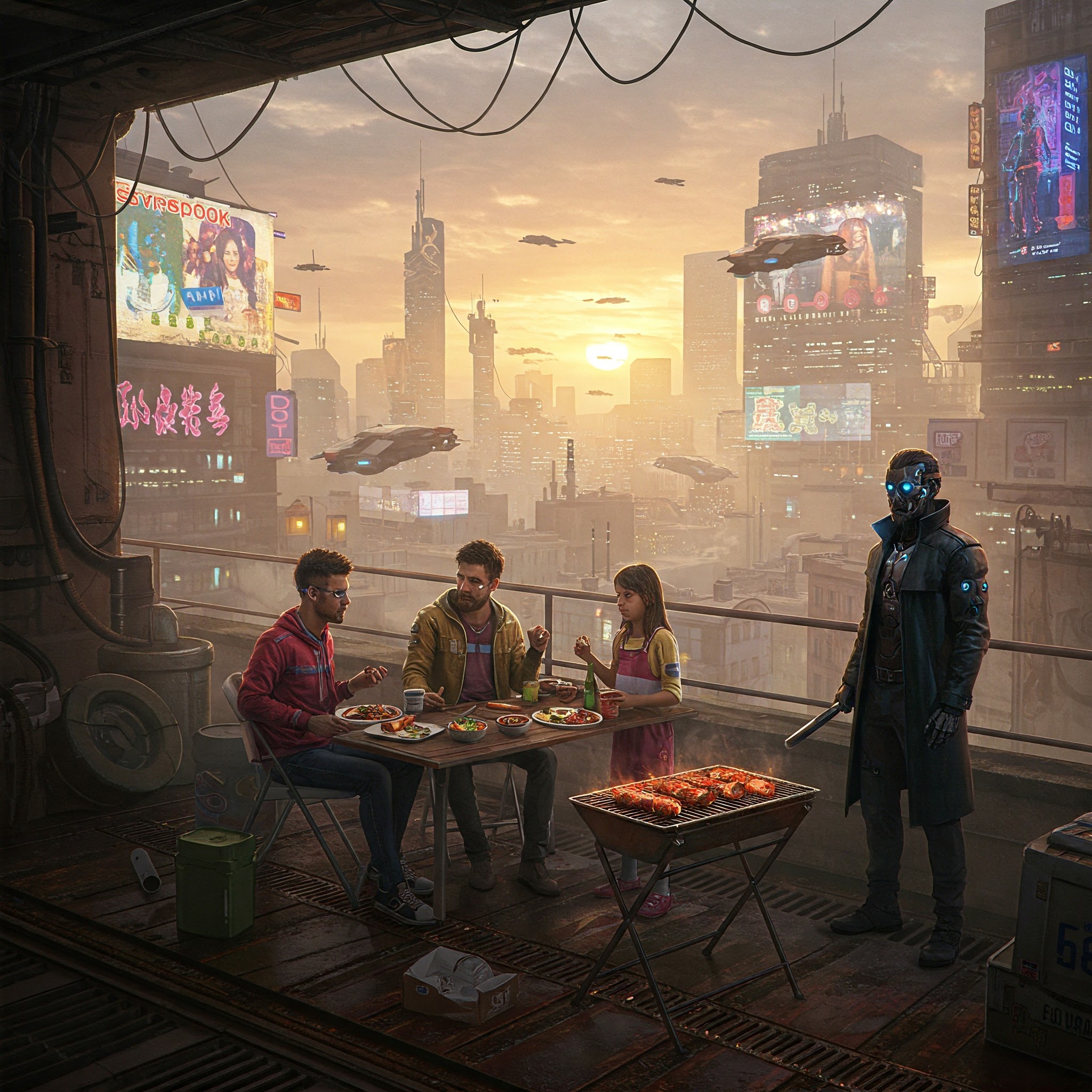 Colin’s grin was involuntary, revealing the titanium inlay where three teeth had been before the Sector Riots. “Because that’s how food is supposed to taste, mijo. Before the corpos standardized everything.” His neural implant tingled as memories surfaced—real barbecues from his childhood, when animals still roamed fields instead of existing as cell cultures in industrial vats.