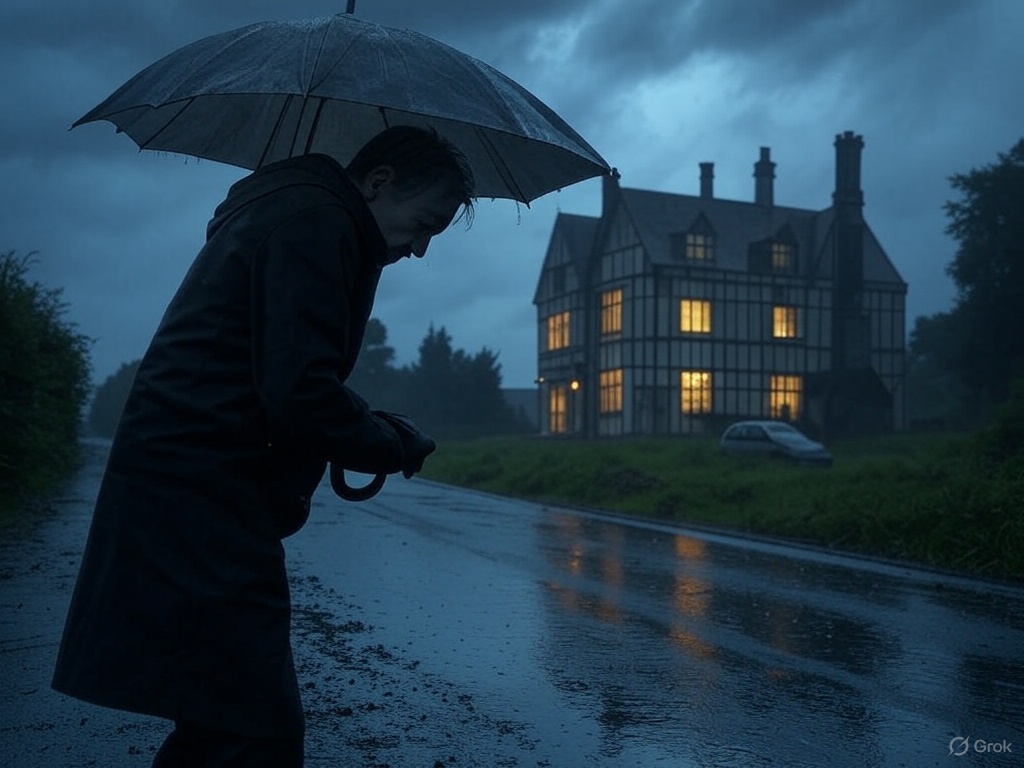 ‘That’s a big storm’, I thought, while I felt the water running below my knees, even though I was driving in my car. My car could not resist the tremendous pressure from the water. I was still blaming myself for not repairing the roof fillings when it finally broke down. It was inevitable, so I left it smartly parked in the middle of the road. Fortunately I had an umbrella, but unfortunately it got stuck when I tried to open it, so I gave in and began to walk under the heavy rain. After twenty minutes walking and five sneezes later, I found a path on one side of the road. On a normal day, even being drunk I would not have followed it, but considering I was tired, with no place to go and on top of it, I was beginning to feel the symptoms of a good cold. I didn’t think much about it and followed the path. When I reached the end of it, and the ninetieth branch made another little hole on my overcoat, I had the doubtful pleasure of meeting the house. I should really say “The House”, or “The Manor”, as it was an enormous Tudor-style construction built in the middle of nowhere. I ran without stopping but to stand up when I fell, as my feet got engaged in a personal chat with a stone. With great effort I reached the front door and knocked on it.