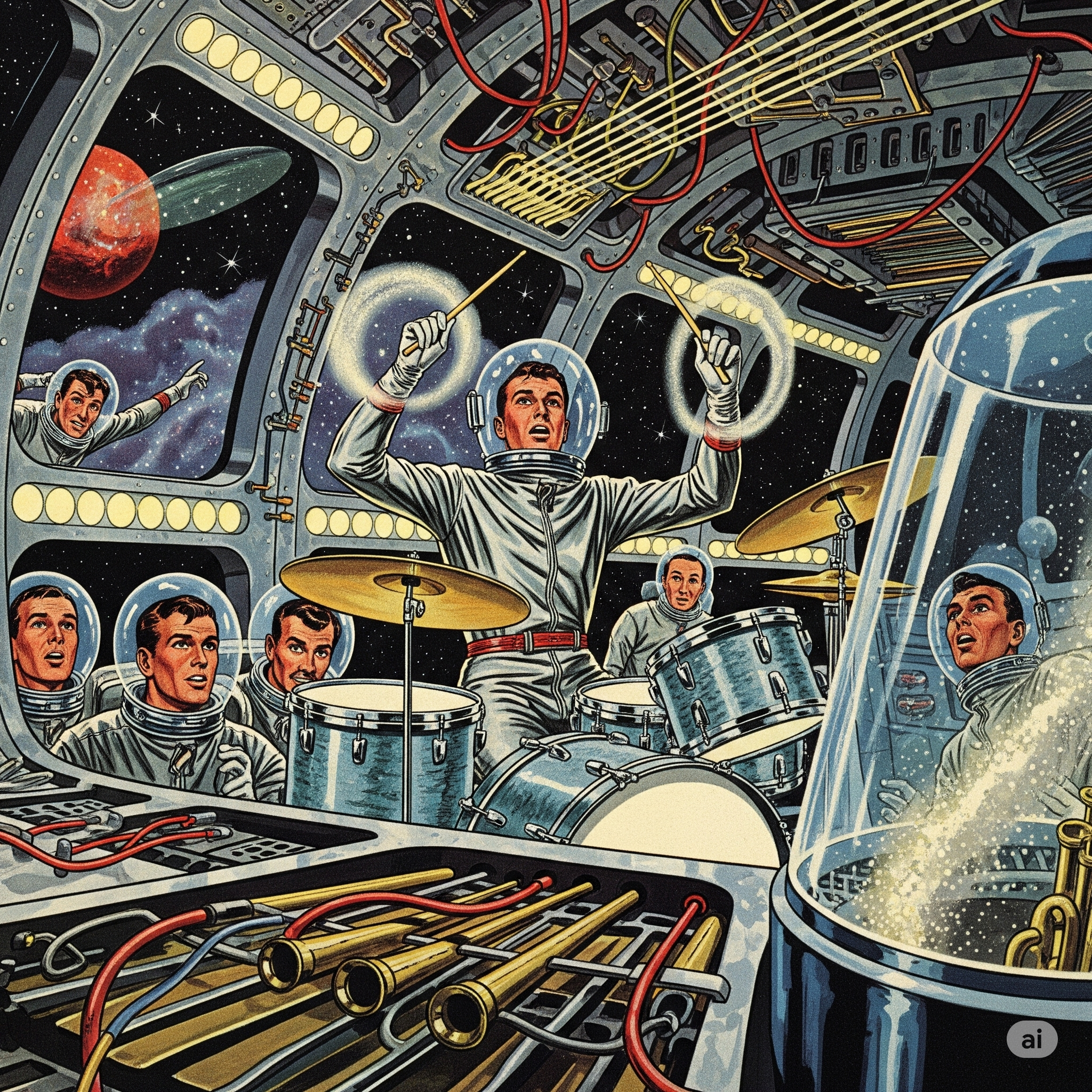 His sticks dance through space, pulling rhythms from our collective madness. The station responds like it’s been waiting months for someone to finally ask it to dance. Every rivet becomes a ride cymbal. Every seal and joint adds its voice to the percussion section. Kepler-7 has become the largest drum kit in human history, and we are its only audience.