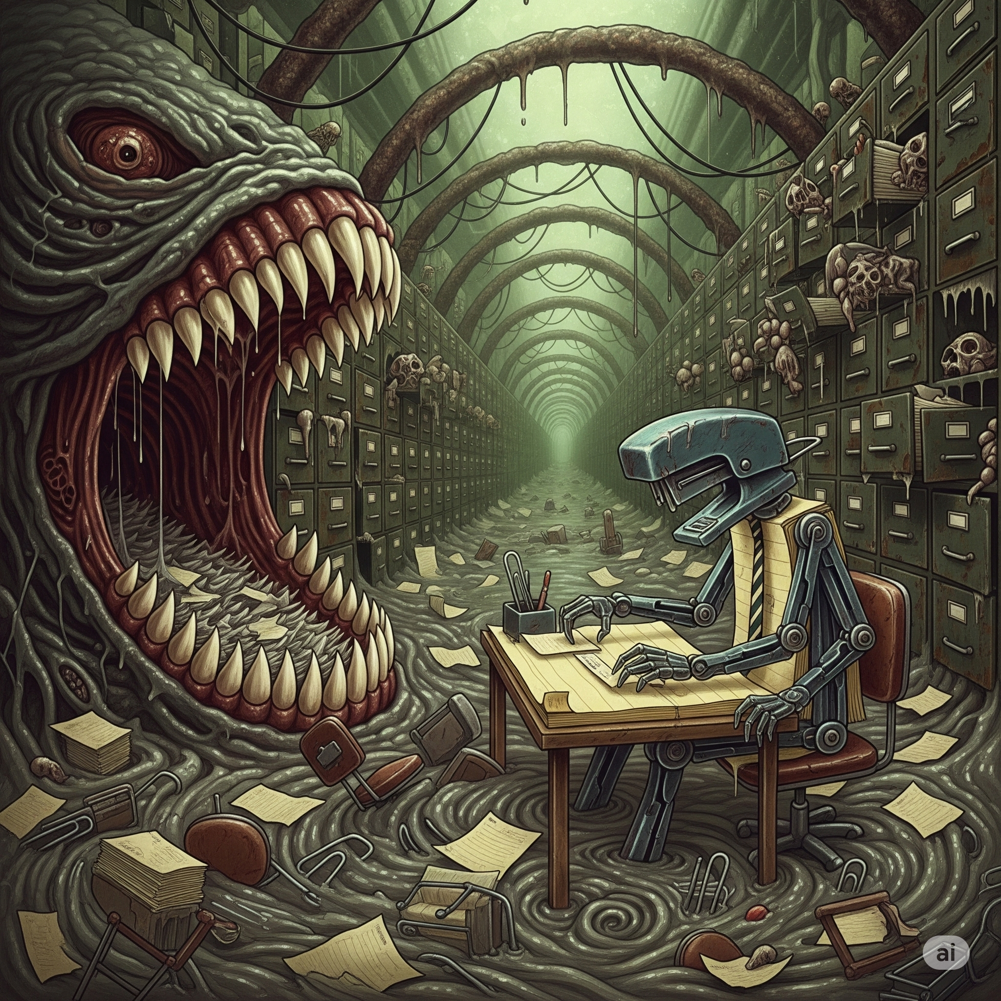 The corridors stretch like the throat of Moloch himself, lined with filing cabinets that tower into darkness, each drawer a mouth that opens and vomits forms that scream when you touch them. The forms writhe in your fingers, begging—actually begging—not to be completed, their text shifting like living things, rearranging themselves into suicide notes.