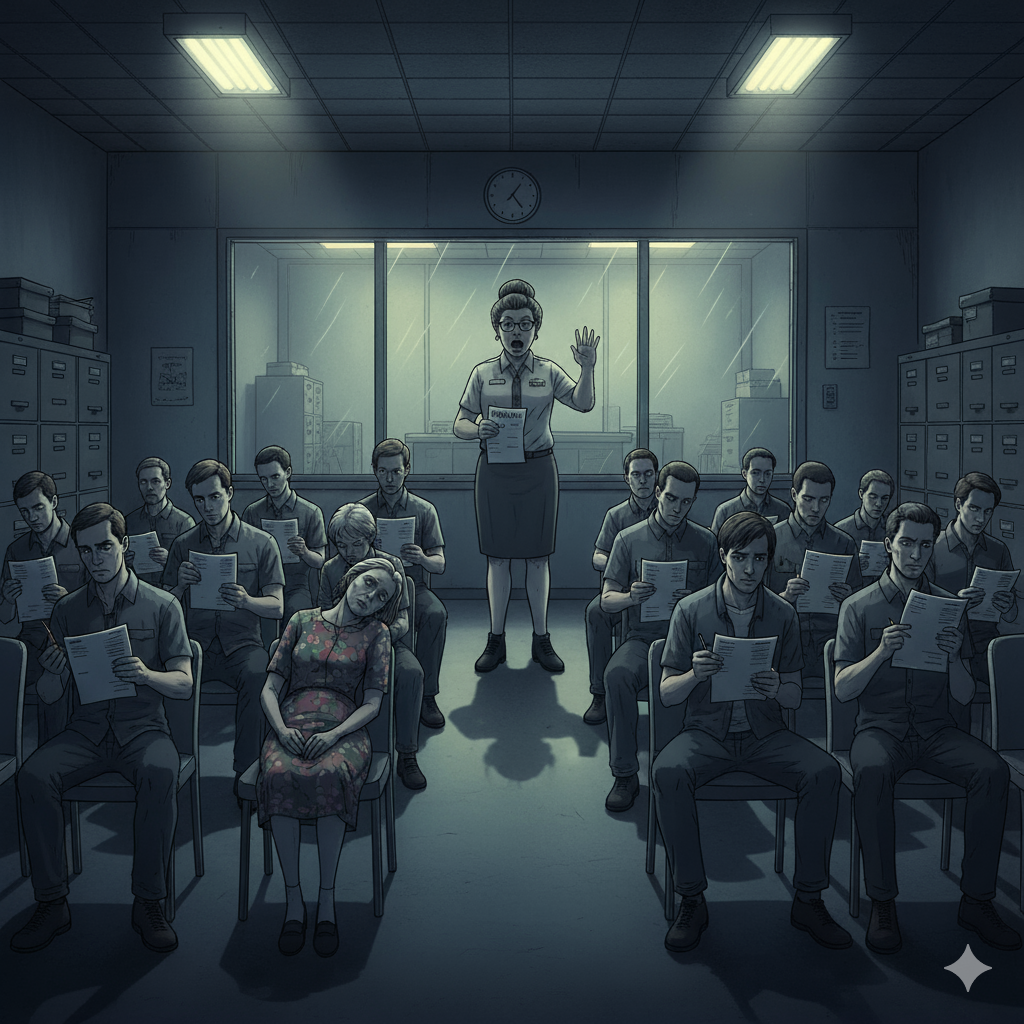 The waiting room contained seventeen people who’d been there since Tuesday. It was now Saturday. Mrs. Henderson in chair four had died Wednesday but nobody wanted to fill out the death certificate because that required different paperwork entirely.
