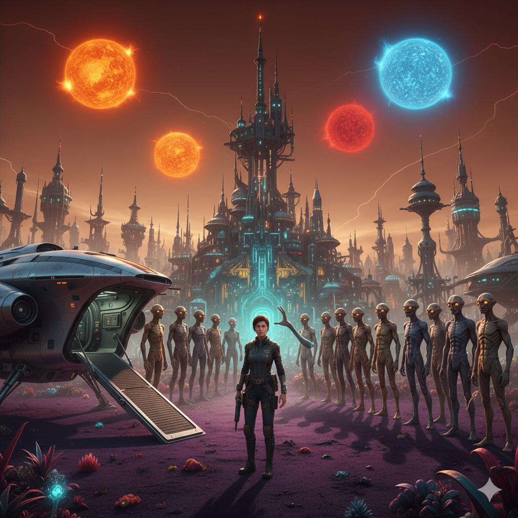 She descended the ramp. The air tasted of copper and burnt cinnamon. Three suns hung in the sky like accusatory eyes. Beneath them, the city sprawled in impossible geometries. These shapes made her inner ear rebel. Not Euclidean. Definitely not Euclidean.